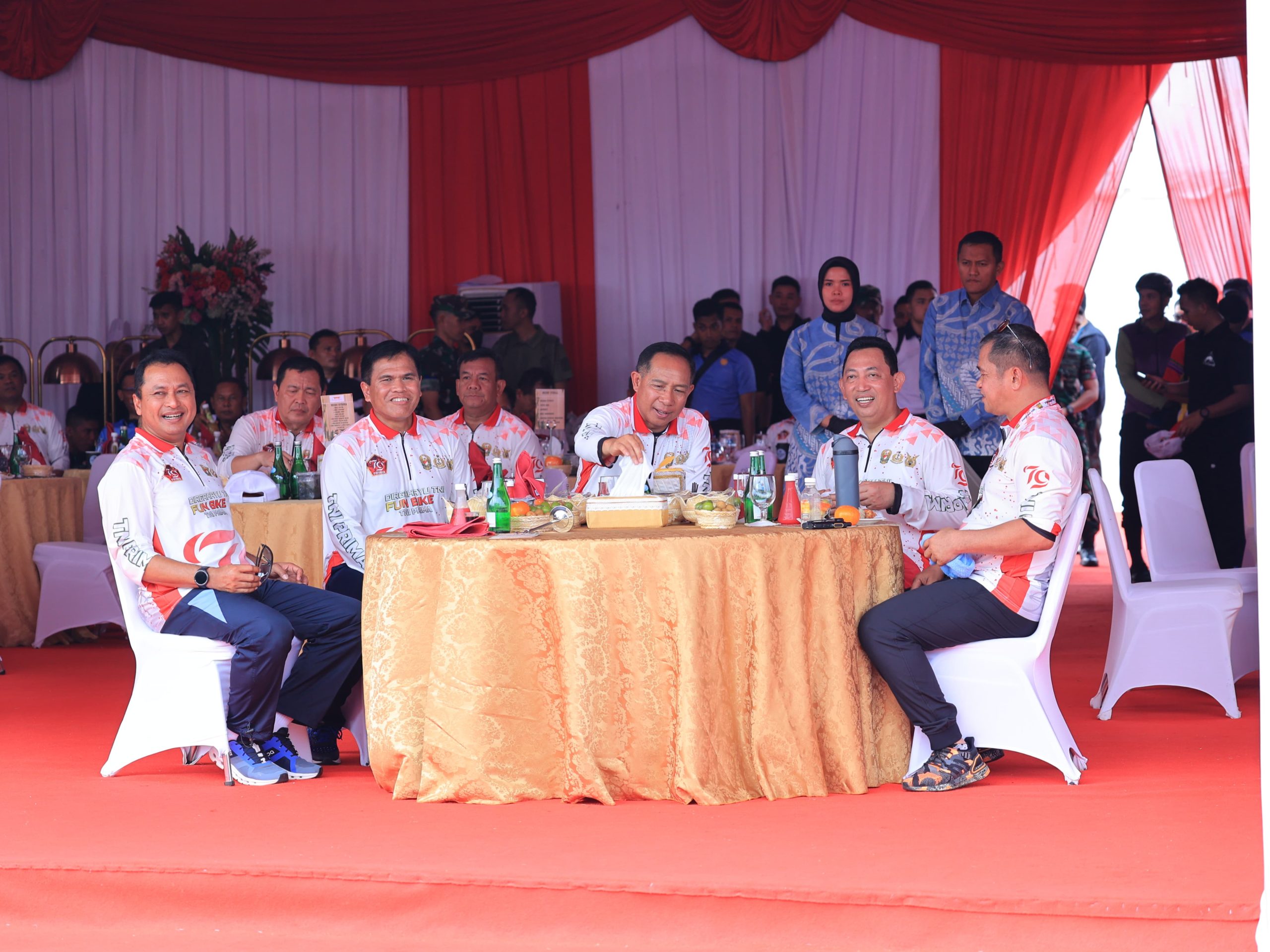 “Pokoknya yang jogetnya paling top, dapet hadiah, nanti hadiahnya ada motor ada sepeda, ada umroh, pokoknya saya dengan Kapolri menghibur,” seru Panglima.