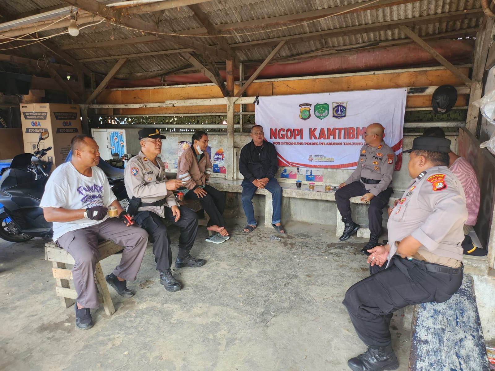 Hadir dalam kegiatan Ngopi Kamtibmas di antaranya Kasatbinmas AKP. Sudirman Agus, S.H., M.H., Kanit Bintibsos Iptu Achmad Mansyur, PS. Kanit Bhabinkamtibmas Aiptu Agus Subekti, Bamin 2 Satbinmas Briptu Ardiyan Cipta Hidayat, dan Buruh Pelabuhan Tanjung Priok serta Komunitas Ojek Pangkalan di Jalan PLTU Pelabuhan Tanjung Priok.(erlita)
