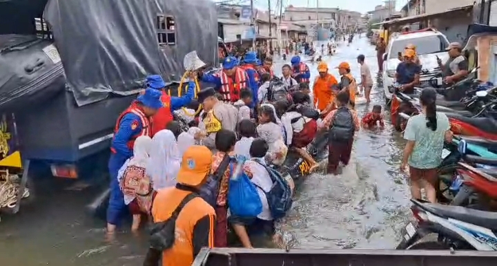 KS, JAKARTA – Bhabinkamtibmas Muara Angke Polsek Kawasan Sunda Kelapa Polres Pelabuhan Tanjung Priok dan Ditpolairud Polda Metro Jaya serta Badan Penanggulangan Bencana Daerah (BPBD) membantu anak-anak sekolah yang akan berangkat ke sekolah dengan menyeberang di lokasi banjir rob di jalan Pelabuhan Muara Angke. Petugas pun mengangkat anak-anak berseragam sekolah untuk mengarungi banjir rob, yang arusnya cukup lumayan deras. Ketinggian air di badan jalan mencapai 40 sentimeter. Salah satu petugas kepolisian yang membantu anak-anak sekolah, yakni Bhabinkamtibmas Muara Angke Polsek Kawasan Sunda Kelapa Polres Pelabuhan Tanjung Priok, Aiptu Setiyono. “Banjir merendam badan jalan sehingga sulit untuk dilalui. Apalagi, bagi anak-anak yang pergi dan pulang sekolah melewati jalan ini. Sehingga kita bersama Satpolair dan BPBD membantu untuk mengarungi banjir rob, agar anak-anak tetap bisa belajar di sekolah,” ucap Setiyono pada wartawan, saat terjadi banjir Rob, Jumat (13/12/2024).