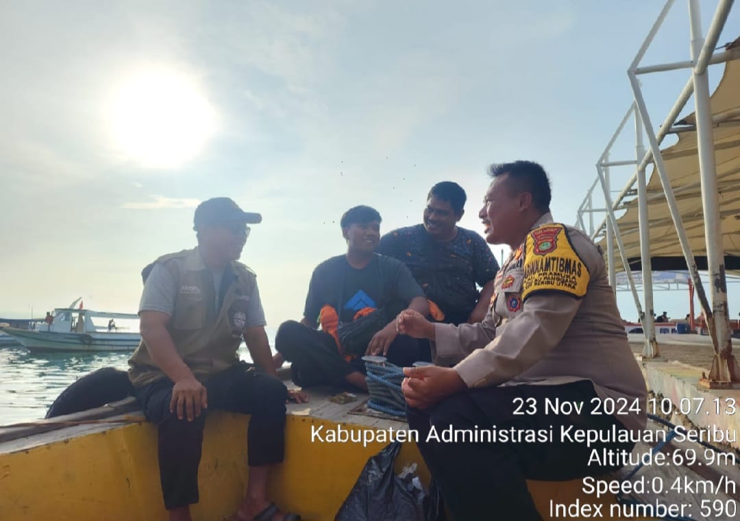 KS, JAKARTA – Bhabinkamtibmas Pulau Pramuka, Polres Kepulauan Seribu, Bripka Marwansyah, melaksanakan kegiatan sambang kepada para nelayan di Pulau Pramuka, Sabtu (23/11/2024). Dalam kunjungan ini, Bripka Marwansyah memberikan imbauan penting terkait keselamatan melaut, khususnya penggunaan life jacket dan kewaspadaan terhadap cuaca buruk yang sering terjadi pada akhir tahun.