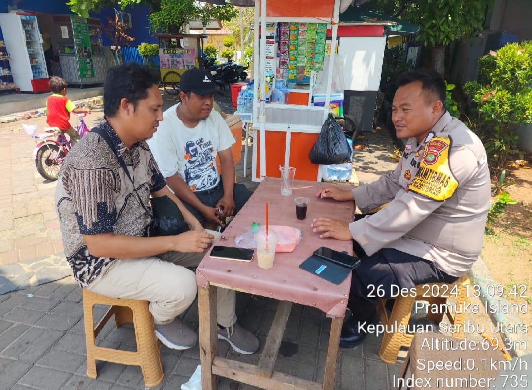 KS, JAKARTA – Menjelang perayaan Natal dan Tahun Baru (Nataru), Bhabinkamtibmas Pulau Pramuka, Polres Kepulauan Seribu, Bripka Marwansyah, melaksanakan kegiatan sambang ke warga untuk menciptakan suasana aman dan nyaman bagi wisatawan, Jumat (27/12/2024).