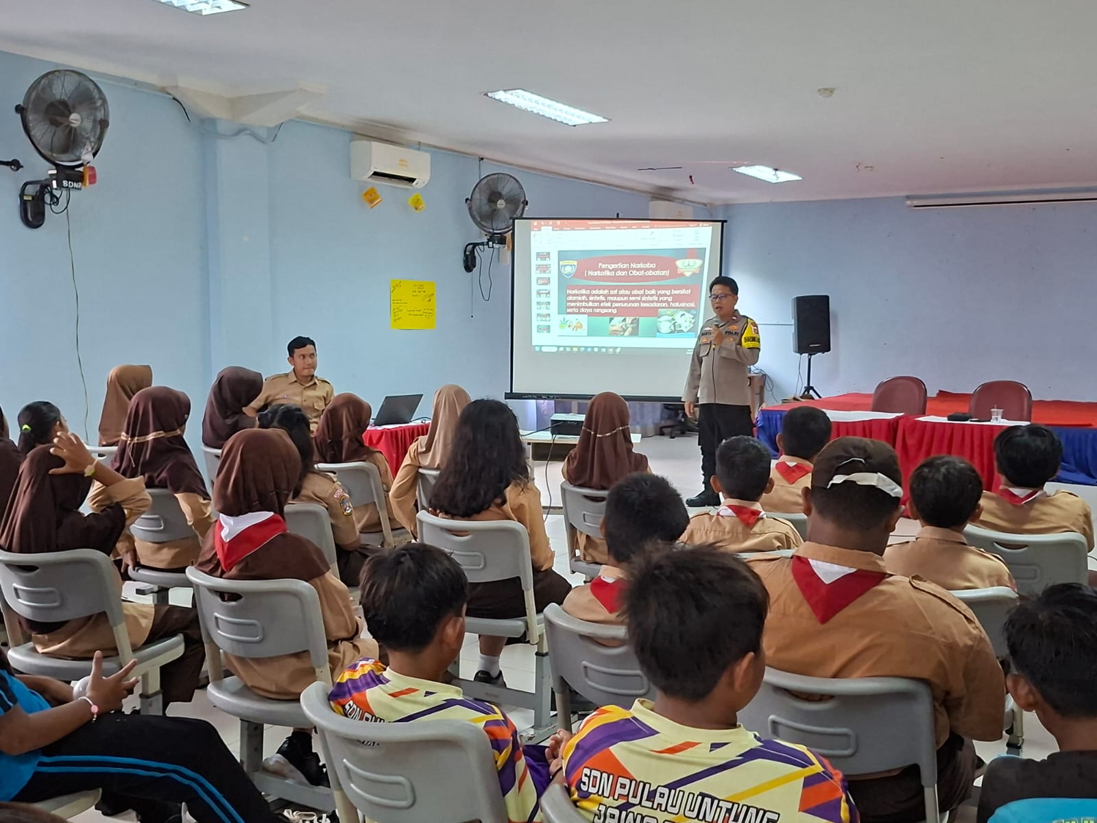 KS, JAKARTA – Bhabinkamtibmas Kelurahan Pulau Untung Jawa, Polres Kepulauan Seribu, Aipda Masito, memberikan sosialisasi kepada siswa-siswi SDN 01 Pagi Kelurahan Pulau Untung Jawa, Kecamatan Kepulauan Seribu Selatan, Rabu (20/08/2025). Kegiatan berlangsung di ruang pola sekolah tersebut dan diikuti oleh siswa kelas V dan VI.