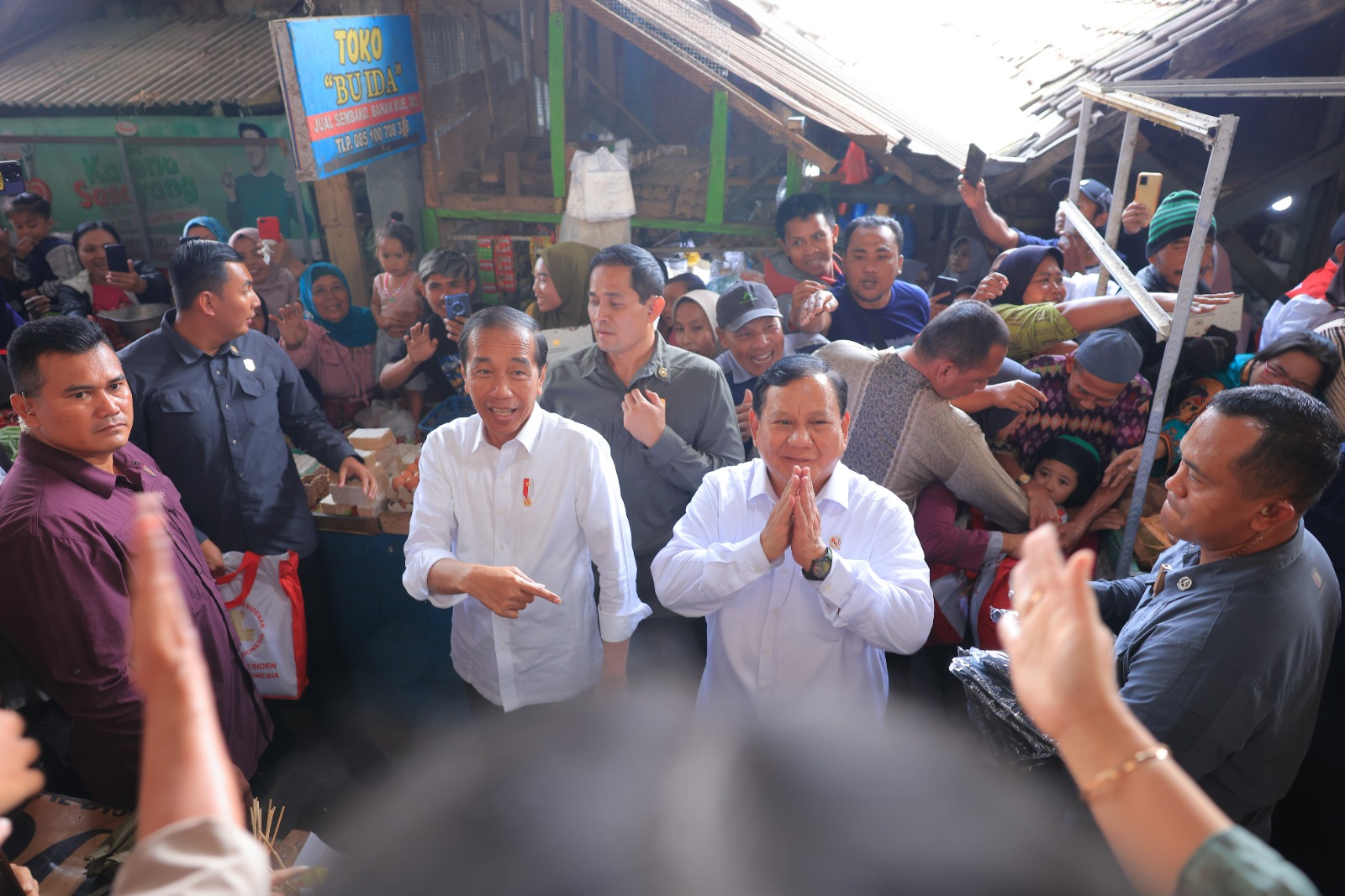 “Pak Prabowo, Pak Prabowo!” antusias teriakan para pedagang menyambut Prabowo yang berjalan beriringan dengan Jokowi.