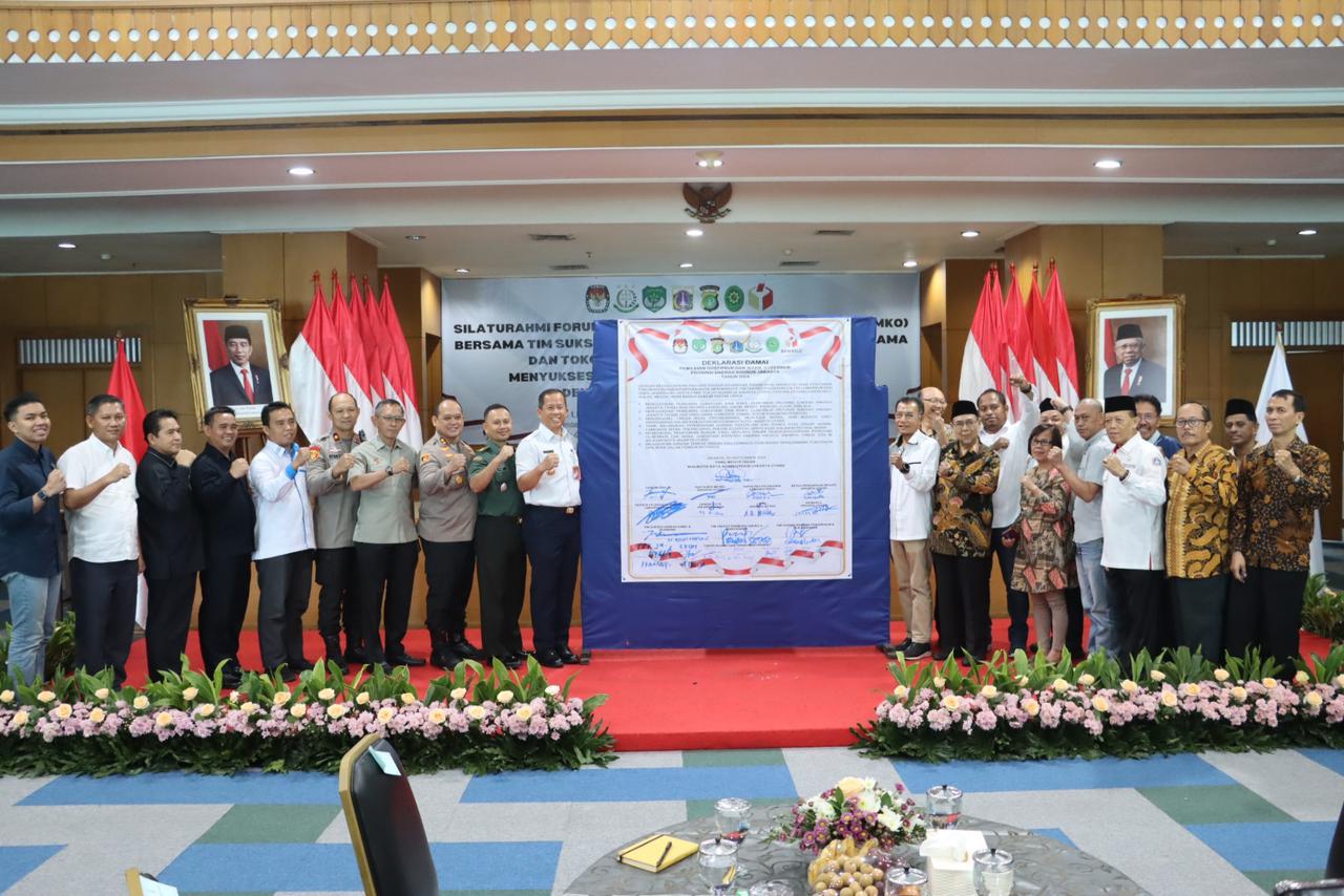KS, JAKARTA – Deklarasi Pilkada Damai Forum Koordinasi Pimpinan Kota (Forkopimko) Jakarta Utara, Rabu (25/09/2024) bertempat di ruang Bahari lantai 14 Gedung Blok P Kantor Walikota Kota Administrasi Jakarta Utara yang dipimpin Walikota Administrasi Kota Jakarta Utara, Dr. Ali Maulana Hakim. S.I.P., M.Si.