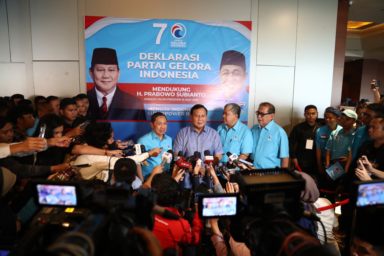 “Salam Gelora, hidup Golkar, hidup PBB, hidup PAN, hidup PSI, hidup semuanya, hidup Gerindra…Hidup PKB!” teriak Prabowo. (ris)