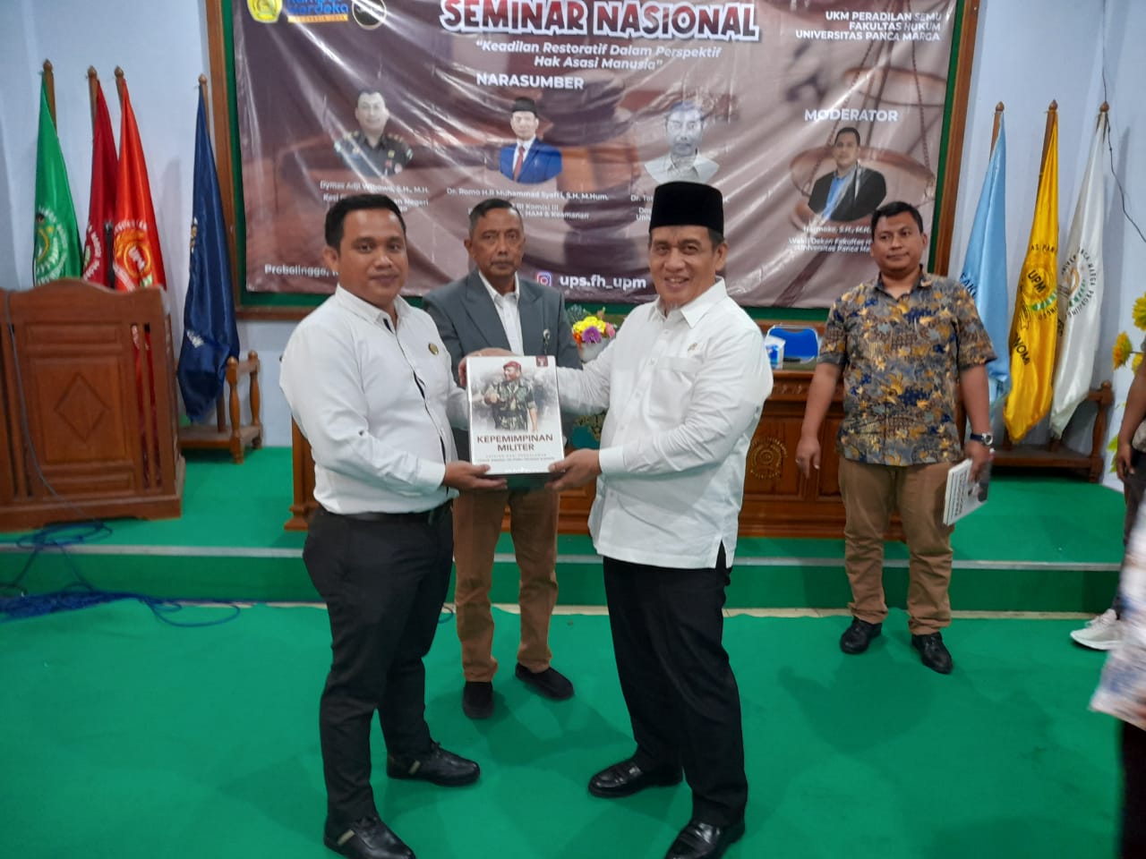 Diakhir acara, Romo Syafii membagikan buku Paradoks Indonesia dan Kepemimpinan militer untuk seluruh tokoh yang hadir. (ris)