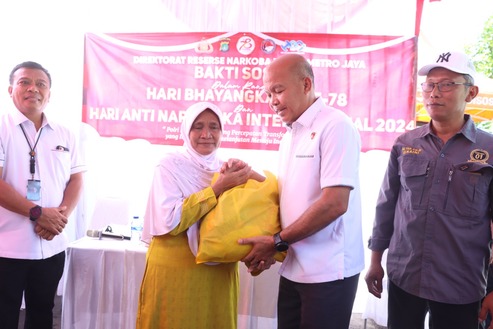 KS, JAKARTA – Dirresnarkoba Polda Metro Jaya Kombes Pol Hengki S.I.K, M.H melaksanakan kegiatan penyuluhan dan Bakti Sosial dalam rangka Hari Bhayangkara ke-78 dan hari Anti Narkoba Internasional 2024 di Jl. Menteng Tenggulum RW 01 Kelurahan Menteng Kecamatan Menteng Jakarta Pusat. Rabu (26/6/2024).