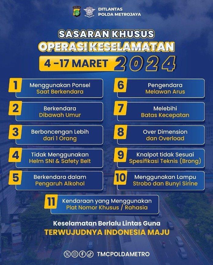 Dalam keteranganya Ade Ary menyebut pelaksanaan penindakan pada Operasi Keselamatan Jaya 2024 dari tanggal 04 Maret hingga 09 Maret 2024 yang dilakukan oleh Ditlantas Polda Metro Jaya dan Polres Jajaran.
