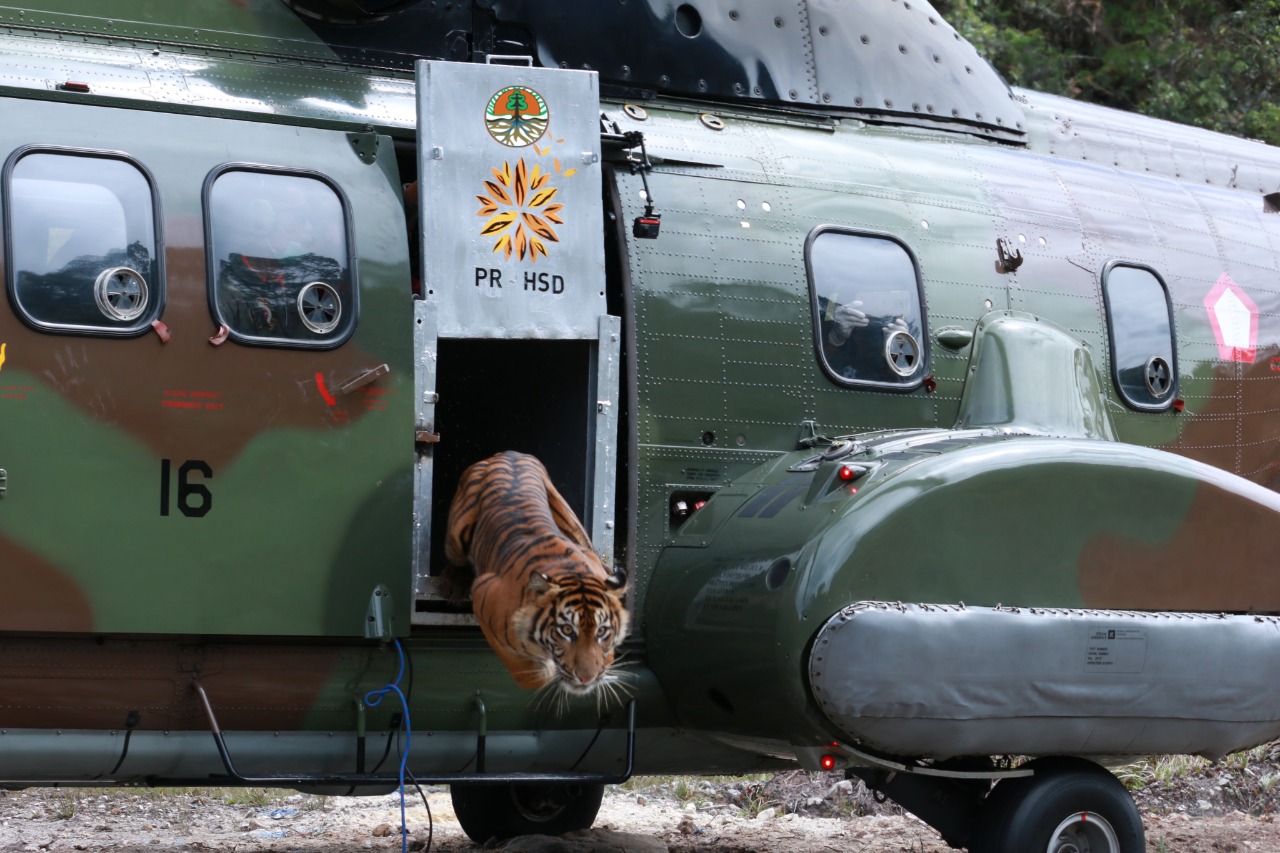 KS, JAKARTA – Balai Konservasi Sumber Daya Alam (BKSDA) Sumatera Barat dan Direktorat Konservasi Keanekaragaman Hayati dan Sumber Daya Genetik (KKHSDG) bersama Yayasan ARSARI Djojohadikusumo (YAD), didukung oleh Kementerian Pertahanan RI melalui Komando Operasi Udara I Pangkalan TNI AU Roesmin Nurjadin, Balai Besar Konservasi Sumber Daya Alam (BBKSDA) Riau, Yayasan Sintas Indonesia, dan Departemen Biologi FMIPA Universitas Andalas telah melakukan pelepasliaran Harimau Sumatera (Panthera tigris sumatrae) berjenis kelamin betina yang diberi nama “Putri Singgulung” di salah satu kawasan konservasi di Sumatera Barat pada (16 Oktober 2022).