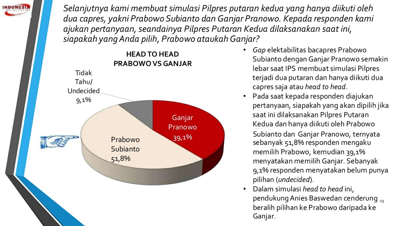 KS, JAKARTA — Indonesia Polling Stations juga melakukan penelitian survei Head to Head pada dua kandidat capres yakni Menteri Pertahanan Prabowo Subianto dan Gubernur Jateng Ganjar Pranowo.