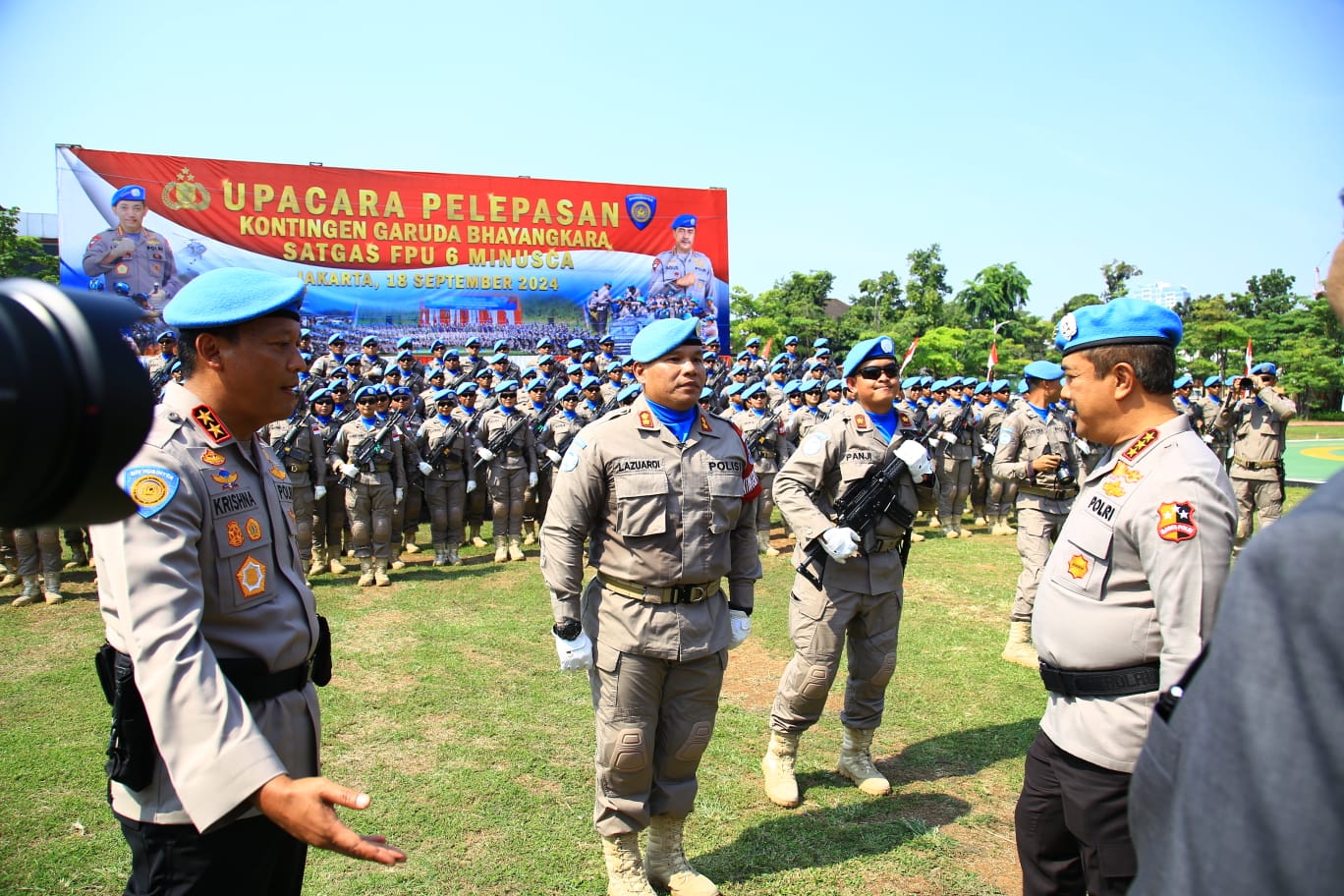 Pemberangkatan kontingen satgas ini dijadwalkan pada bulan depan tepatnya pada hari Kamis tanggal 10 Oktober 2024. Upacara ini dihadiri oleh tamu penting antara lain Ketua Komisi III DPR RI, Pejabat Utama Mabes Polri, para Diren dari Kemenlu, Kemendikbudristek, Kemenhan, Kemenparekraf, Kemenkumham, Kemenkeu, Komisioner Kompolnas dan Komandan PMPP TNI serta Ketua Umum LVRI.