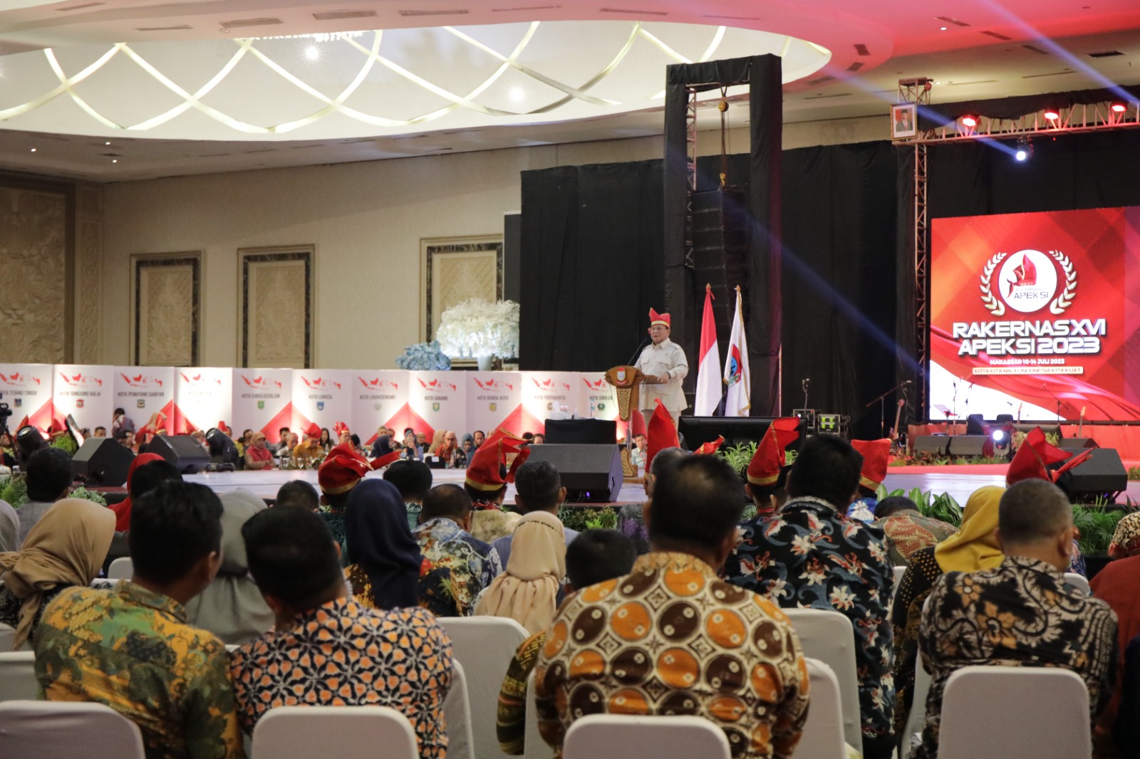 KS, MAKASSAR — Prabowo Subianto mengundang gelak tawa para hadirin yang datang dalam acara Rakernas XVI Apeksi 2023 yang dihelat di Makassar, Kamis Sore (13/7).