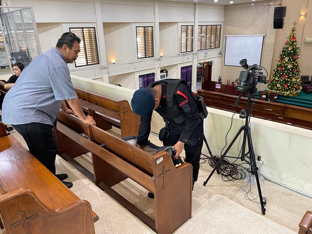 KS, JAKARTA – Polres Metro Jakarta Barat bersama dengan Tim Brimob gegana Polda Metro Jaya melakukan sterilisasi disejumlah gereja di wilayah Jakarta Barat, Minggu, (24/12/2023).