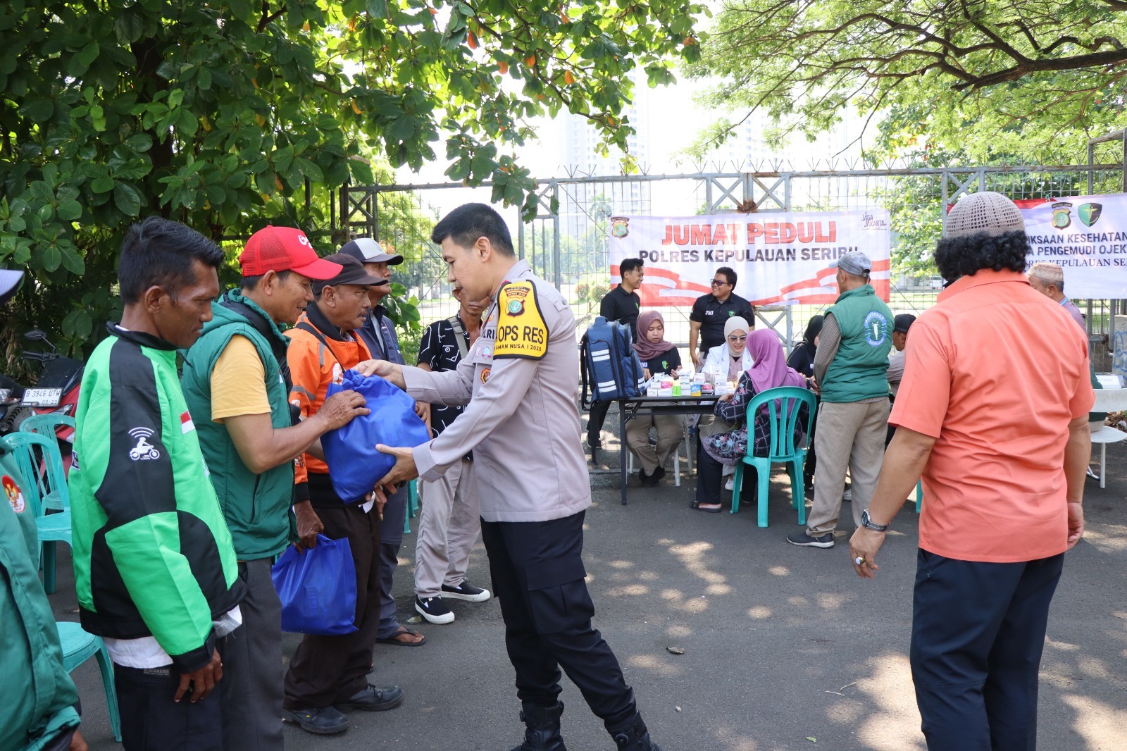 Jumat Peduli, Polres Kepulauan Seribu Bagi Sembako dan Cek Kesehatan Gratis untuk Ojol di Ancol