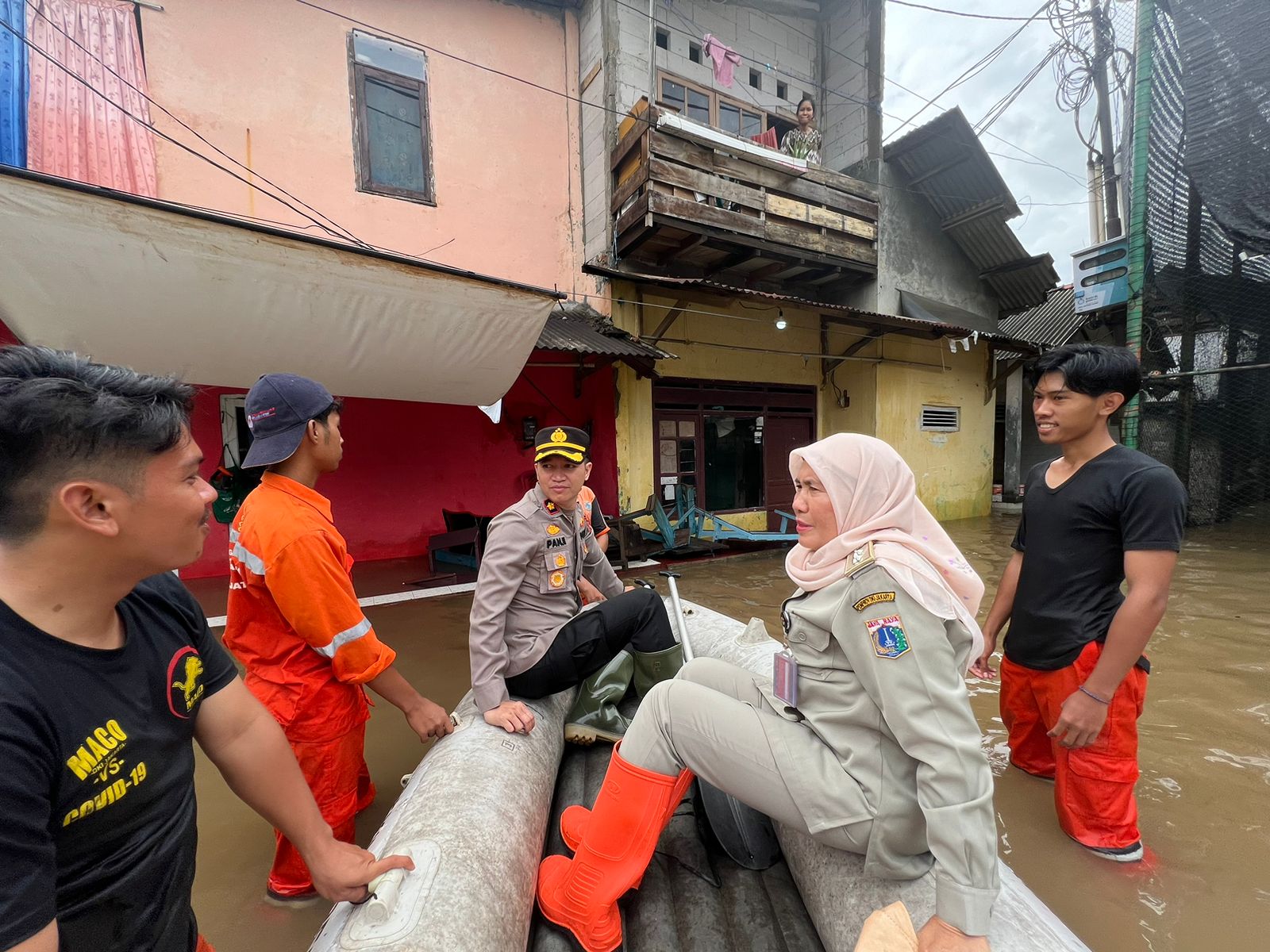 Kapolsek Pancoran Kompol Panji Ali Candra mendatangi pemukiman warga dengan menaiki perahu karet meninjau wilayah RT 004/07 jalan Raya TMPN Kalibata Gang Binamarga Kelurahan Rawajati Kecamatan Pancoran Jakarta Selatan yang terkena dampak luapan air kali ciliwung, senin (27/2/2023).