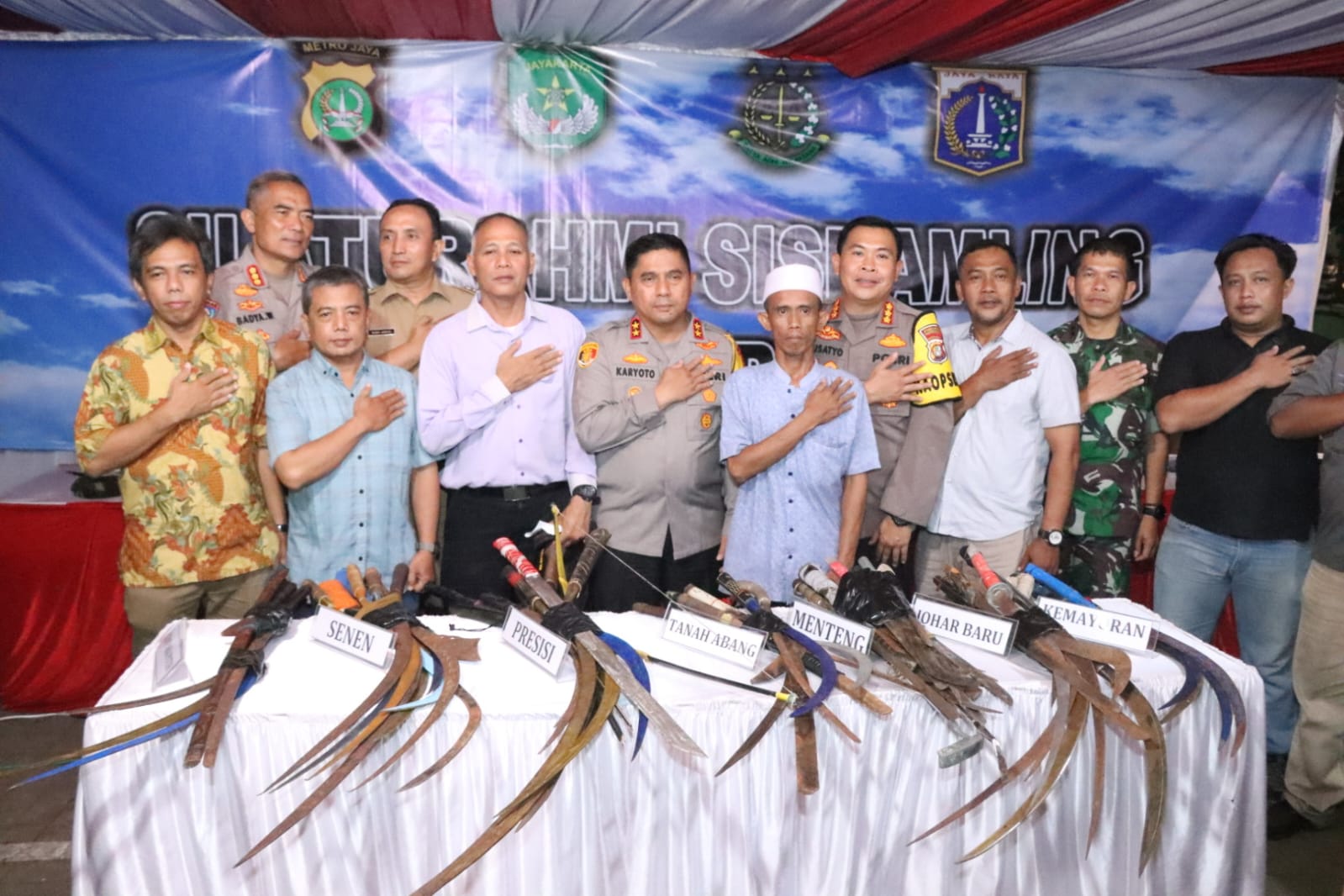 Pada kegiatan ini, Karyoto juga memberikan bantuan 7 buah speaker portable, 7 Barcod kamtibmas dan 2 Senter kepada kelurahan Setempat dan menerima 69 senjata tajam alat tawuran dari masyarakat untuk diamankan pihak kepolisian.