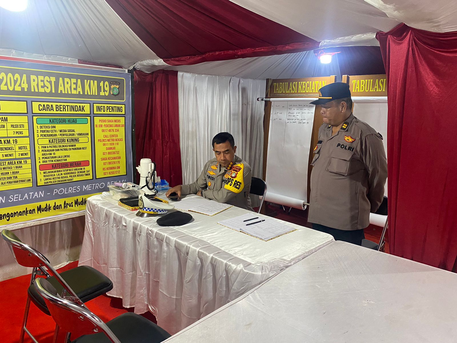 KS, BEKASI – Kapolres Metro Bekasi Kombes Pol. Twedi Aditya Bennyahdi bersama Pejabat Utama Polres Metro Bekasi melakukan pengecekan dan pengawasan arus balik Lebaran 2024 di Pos Pelayanan Gedung Juang Tambun, Jalan Sultan Hasanudin, Tambun Selatan, Kabupaten Bekasi. Minggu (14/4/2024) dini hari.