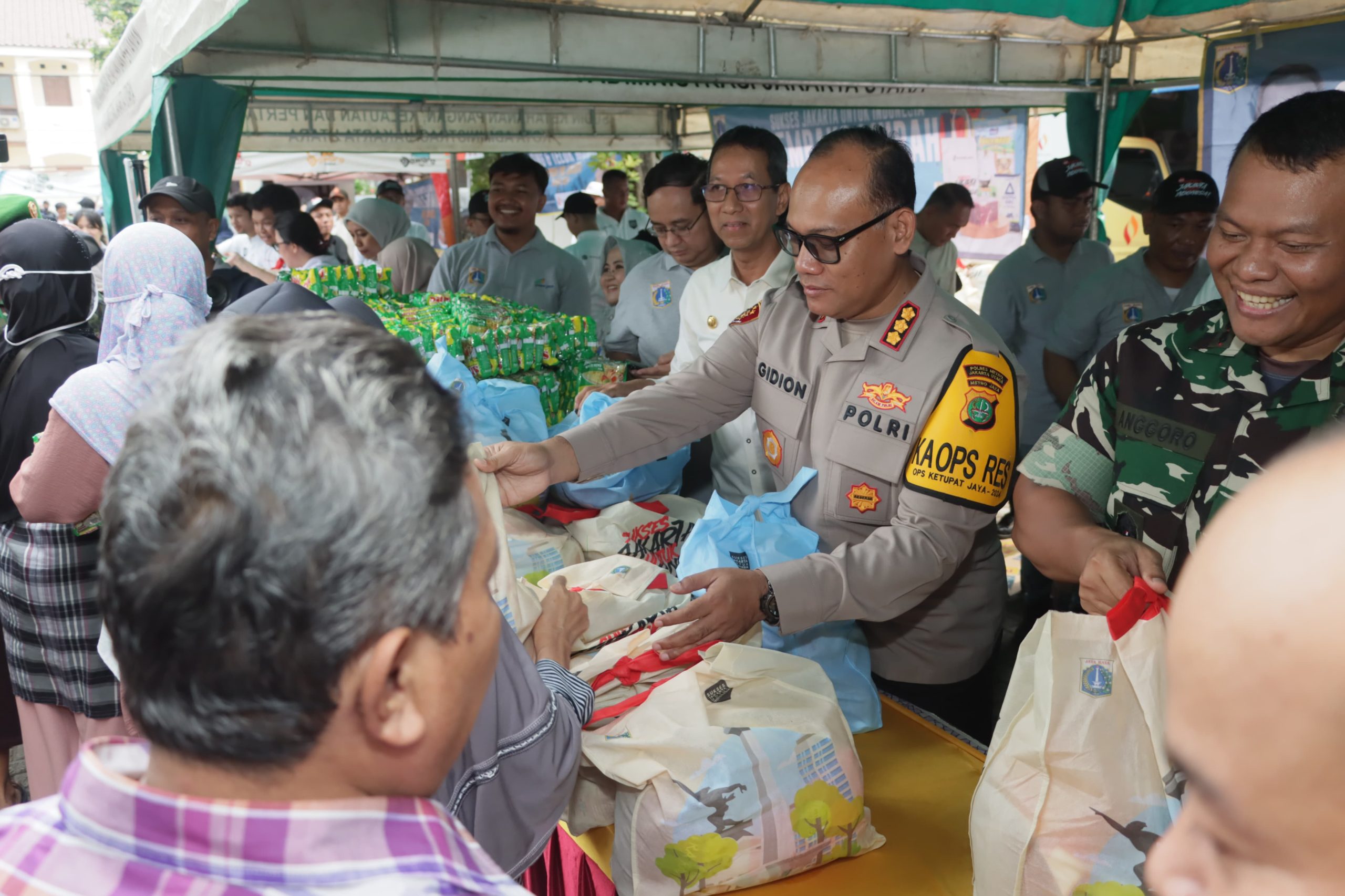KS, JAKARTA – Kapolres Metro Jakarta Kombes Pol Gidion Arif Setyawan mengawal kegiatan bazar Sembako murah di Kantor Kelurahan Papanggo, Tanjung Priok, Jakarta Utara, Sabtu (6/4/2024).