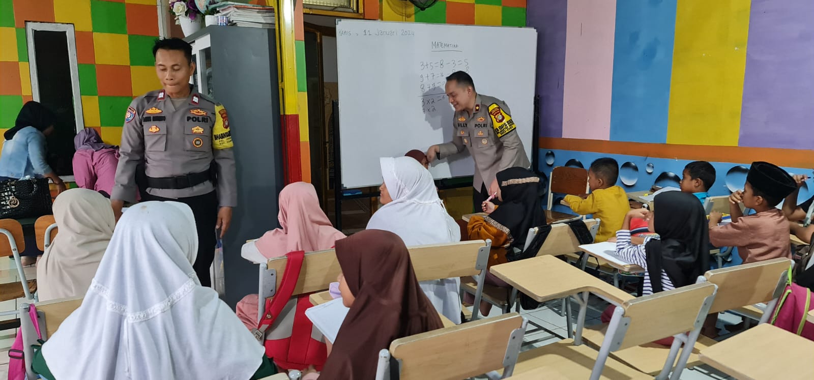 Dengan penuh semangat, Kompol Billy Gustiano berinteraksi langsung dalam kegiatan pengajaran di sekolah tersebut.