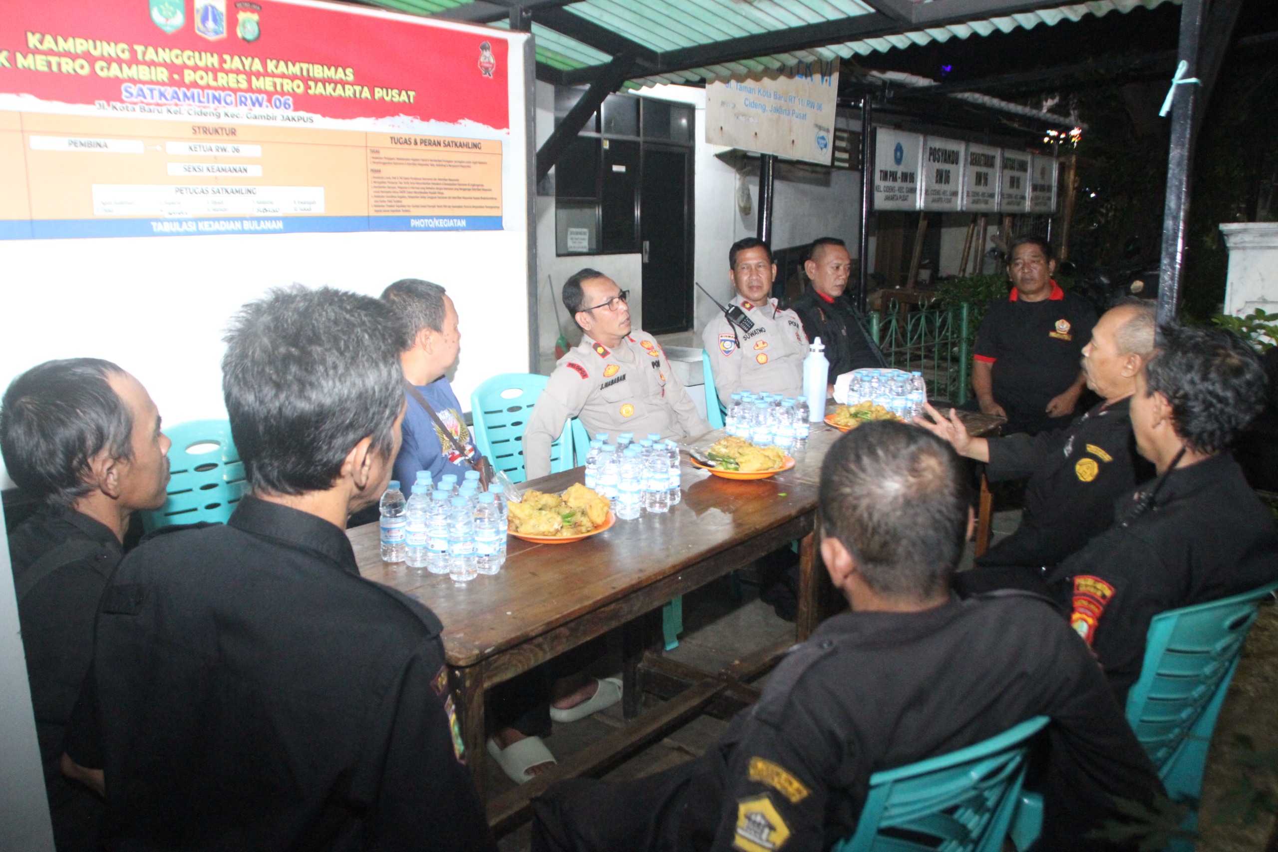 Kapolsek Metro Gambir bersama dengan Kanit Binmas Polsek Metro Gambir menyambangi petugas Satkamling RW 06 Cideng, Gambir, Jakarta Pusat. Dihadiri para RT (Rukun Tetangga) setempat. Kapolsek juga memberikan imbauan Kamtibmas agar tetap waspada terutama di jam rawan kejahatan seperti dini hari menjelang pagi hari.