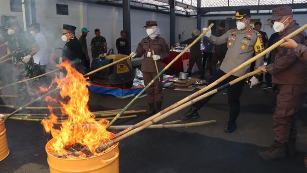 “Untuk barang bukti berupa ganja, pakaian, barang lainnya dan alat hisap sabu (bong) dengan cara dibakar. Senjata tajam dengan cara dipotong, minuman beralkohol dengan cara dilindas dengan alat berat. Sedangkan untuk barang bukti berupa sabu dengan cara dilarutkan dalam air dan cairan kimia,” jelasnya.