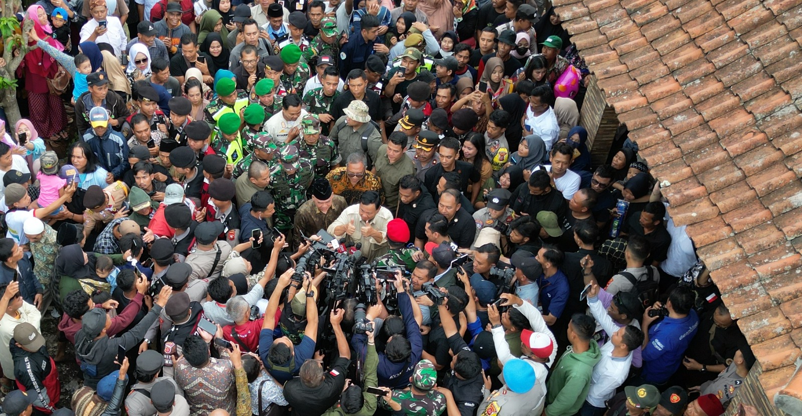 Prabowo yang berjalan menuju ke tempat itu juga disambut riuh tepuk tangan para warga yang turut menyemarakkan meski di tengah kerumunan yang saling berdesakan ingin berinteraksi dengan Prabowo secara langsung.