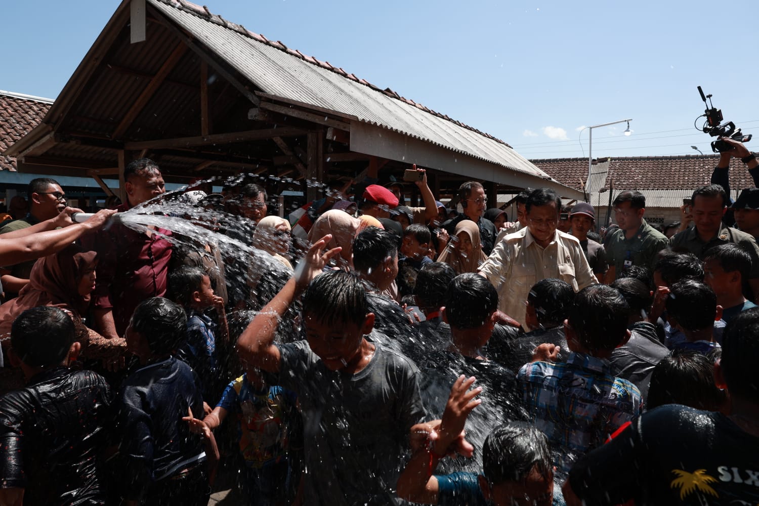 Prabowo ikut basah-basahan bersama anak-anak di Wareng yang riang gembira bermain air dari kucuran pipa. Terlebih, cuaca siang hari saat itu sangat terik.