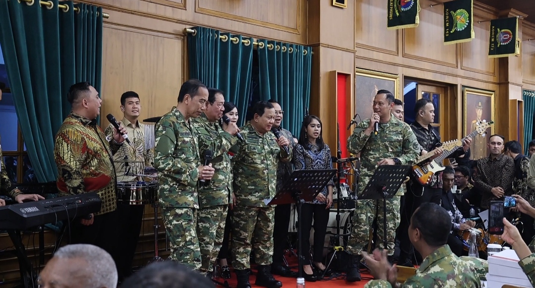 KS, MAGELANG — Momen hangat dan kompak kebersamaan Presiden Prabowo Subianto nyanyi bareng dengan Presiden ke-6 Susilo Bambang Yudhoyono dan Presiden ke-7 Joko Widodo terjadi saat Gala Dinner di Retreat Kepala Daerah di Ruang Makan Nasution, Akademi Militer Magelang, Jawa Tengah, Kamis malam.