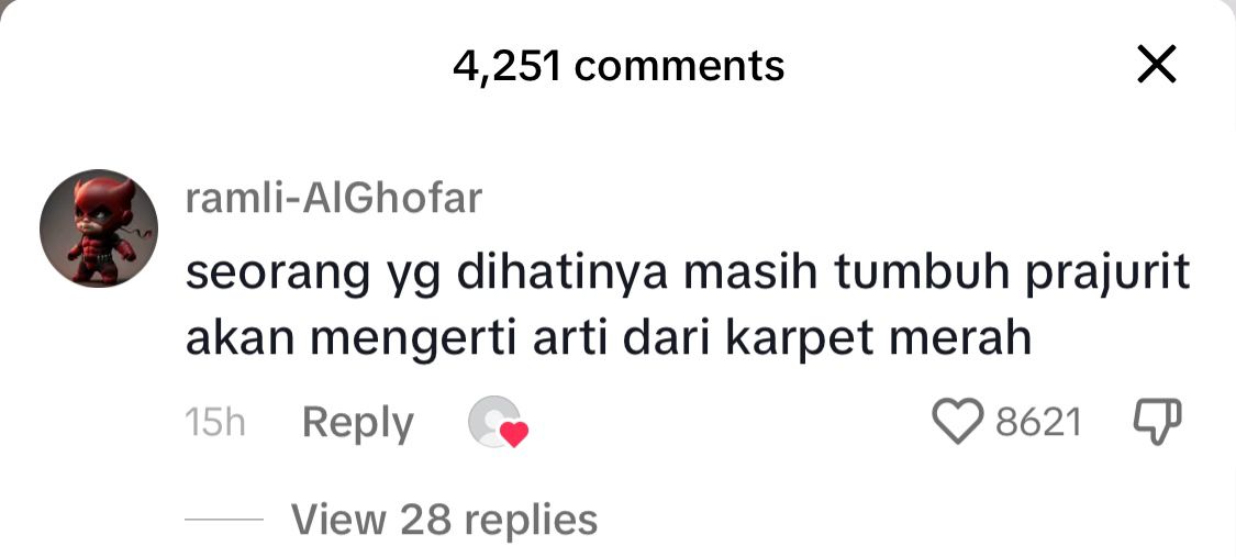 “Seorang yang dihatinya masih tumbuh prajurit akan mengerti arti dari karpet merah.” ujar akun @Ramli-Alghofar