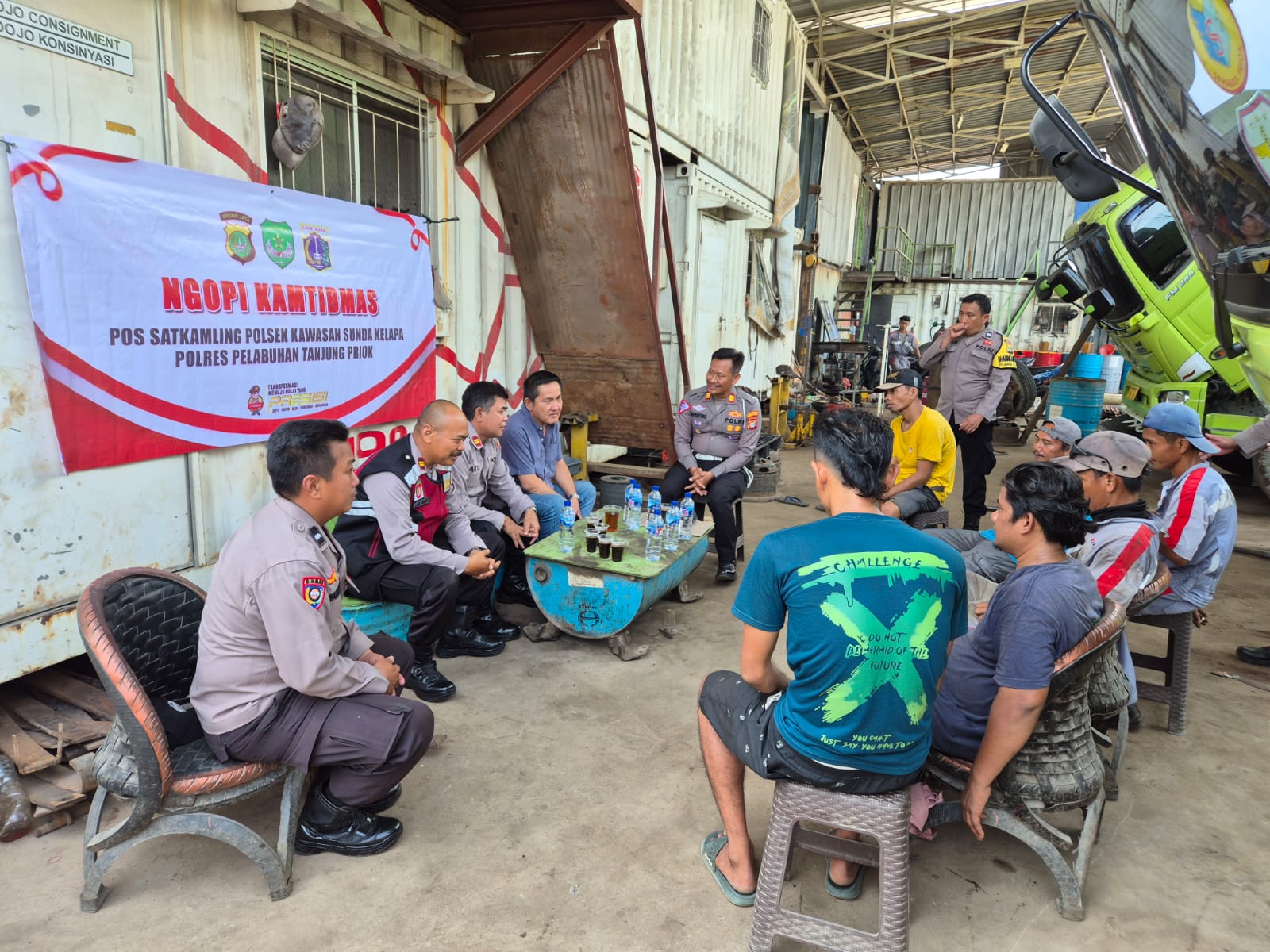 Dengan menggelar Ngopi Kamtibmas untuk Pilkada yang aman dan damai di wilayah hukum Polsek Kawasan Sunda Kelapa Polres Pelabuhan Tanjung Priok, Kapolres Pelabuhan Tanjung Priok AKBP Indrawienny Panjiyoga, melalui Kapolsek Kawasan Sunda Kelapa AKP Hitler Napitupulu, yang dihadiri Kanit Lantas Polsek Kawasan Sunda Kelapa AKP Supriyono, Kanit Binmas Polsek Kawasan Sunda Kelapa Iptu Aji Mulyanto, Panit Binmas Iptu Mashudi, Panit Samapta Iptu Agus Widodo, dan Bhabinkamtibmas Aipda Wahyu Punto Dewo bersama pengurus Dumtruck PT. SINO Bapak Eben dan supir angkutan pasir Kawasan Sunda Kelapa, Senin (30/09/2024), bertempat di PT. SINO Jalan Pelabuhan Sunda Kelapa.