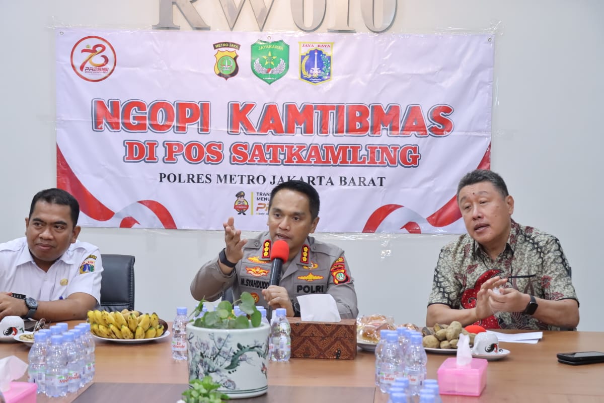 KS, JAKARTA – Kapolres Metro Jakarta Barat Kombes Pol M Syahduddi menggelar kegiatan bertajuk “Ngopi Kamtibmas di Pos Kamling” bersama warga RW 10, Perumahan Green Garden, Kedoya Utara, Kebon Jeruk, Jakarta Barat, Rabu, (7/8/2024).