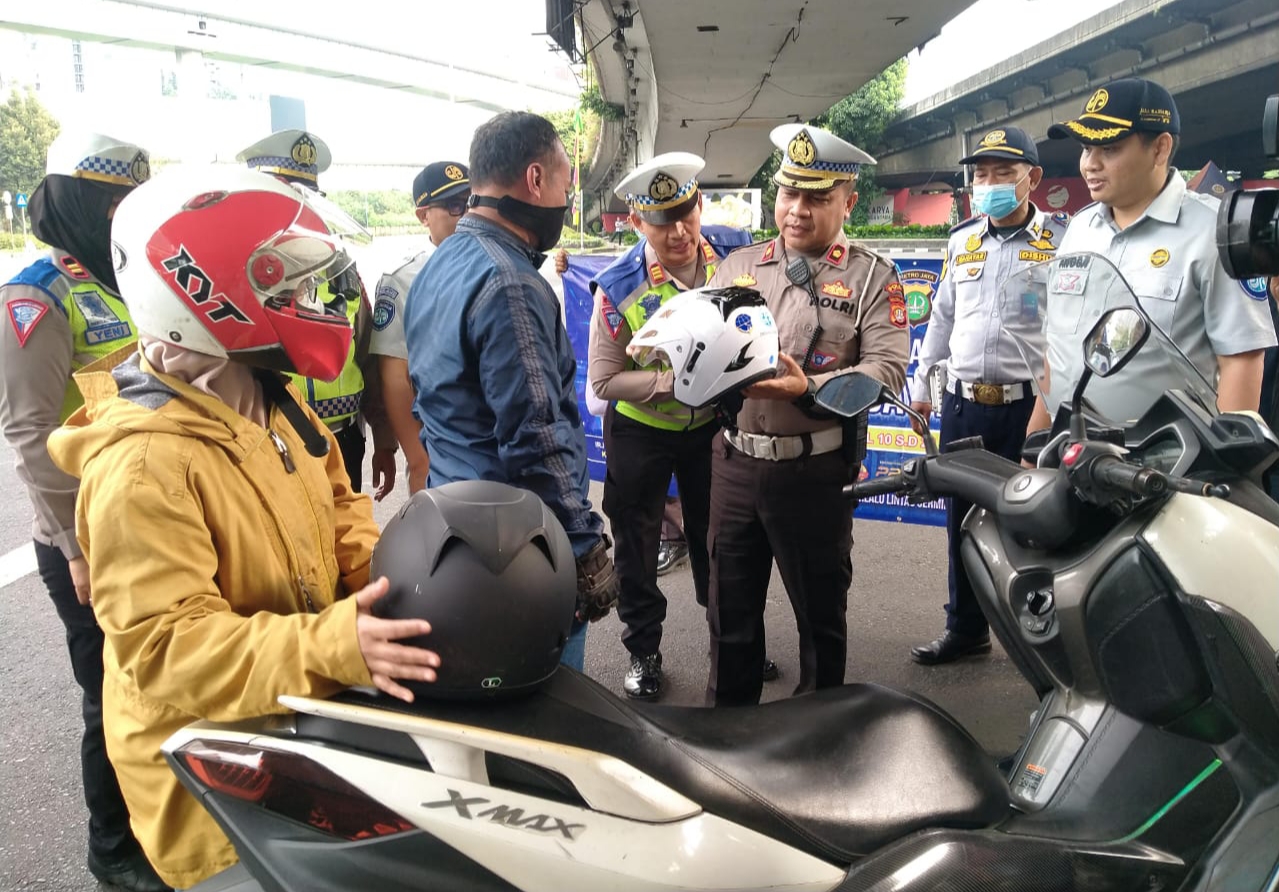 KS, JAKARTA – Operasi Patuh Jaya 2023, Satuan Lalulintas (Satlantas) Polres Metro Jakarta membagikan helm bagi pengendara roda dua yang taat berlalulintas, Jumat (21/7/2023).