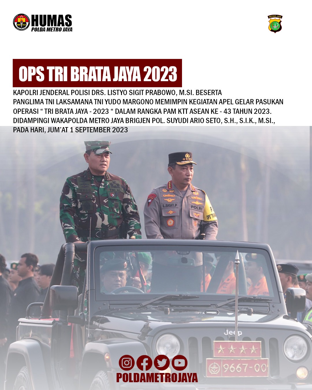 Kapolri Jendral Polisi DRS. Listyo Sigit Prabowo,M.SI. Beserta Panglima TNI Laksamana TNI Yudo Margono Memimpin Kegiatan Apel Gelar Pasukan Operasi “TRI BRATA JAYA-2023” Dalam Rangka Pam KTT ASEAN KE -43 Tahun 2023. Di dampingi Wakapolda Metro Jaya BRIGJEN POL. Suyudi Ari Seto, S.H.,S.I.K.,M.SI.,Pada Hari Jumat 1 September 2023.