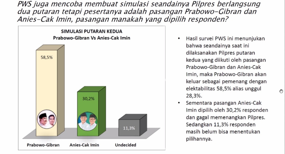 Hasil riset yang dilaksanakan pada tanggal 1 hingga 8 November 2023 di 34 provinsi di seluruh Indonesia dengan jumlah sampel 1220 responden menunjukkan bahwa pasangan Prabowo-Gibran memimpin dengan elektabilitas sebesar 39,7%, unggul signifikan atas pasangan Ganjar-Mahfud MD (34,8%) dan Anies-Cak Imin (22,4%). Meskipun terdapat isu politik dinasti dan gonjang-ganjing putusan Mahkamah Konstitusi (MK) mengenai batas usia cawapres, elektabilitas pasangan Prabowo-Gibran tidak tergoyahkan.