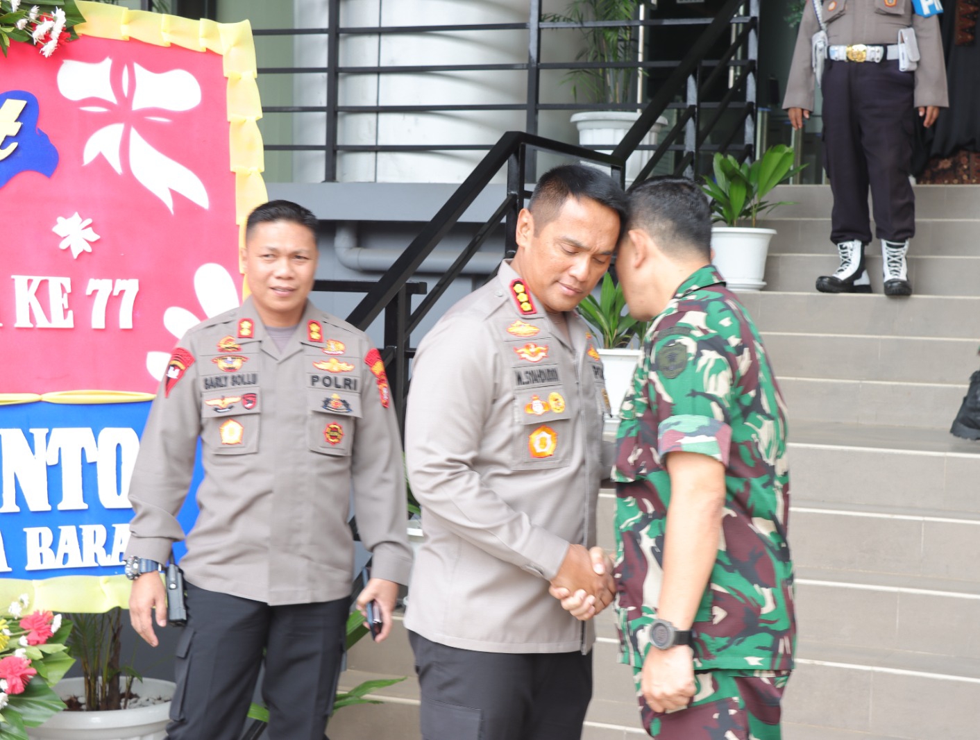 Dalam momentum tersebut tampak terlihat Dandim 0503 JB Letkol Inf Eko Syah Putra memberikan secara simbolis potongan nasi tumpeng kepada kapolres Metro Jakarta Barat Kombes Pol M Syahduddi sebagai bentuk kedekatan dan kekompakan TNI-Polri di Jakarta Barat.