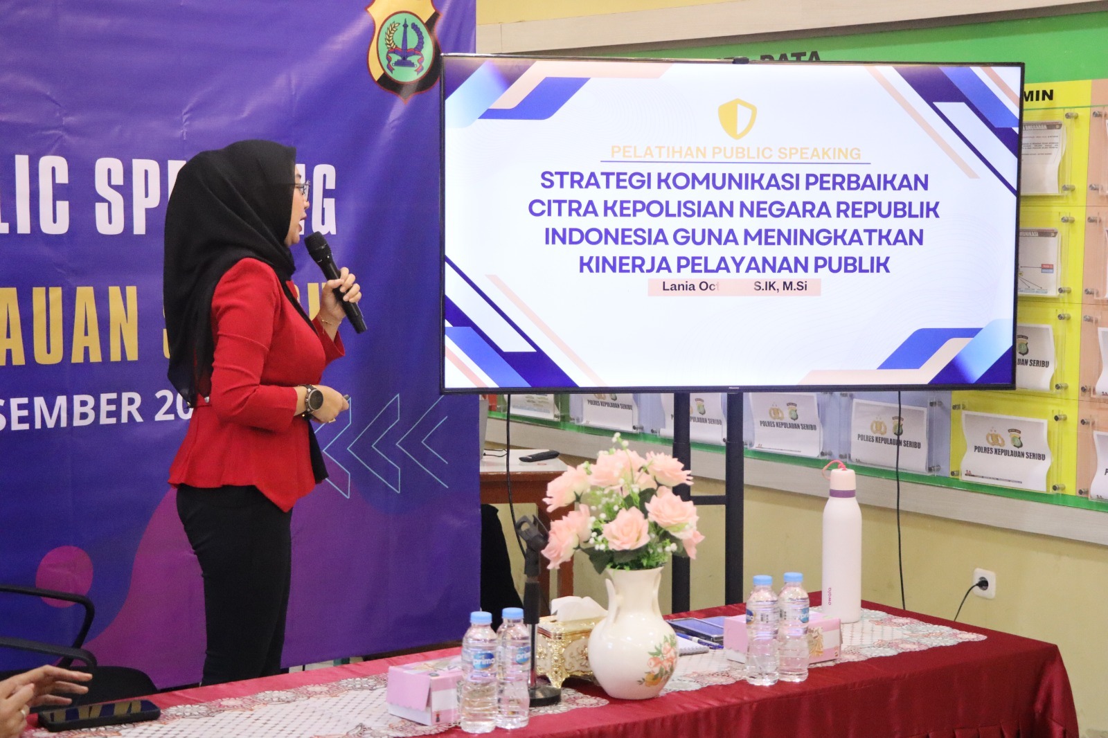 Pelatihan menghadirkan narasumber Lania Octorra, S.IK., M.Si., dengan materi bertajuk *Peran Public Speaking dalam Tugas Kepolisian*. Dalam paparannya, Lania menekankan bahwa kemampuan berbicara di depan publik merupakan keterampilan strategis bagi anggota Polri, terutama dalam memberikan pelayanan, menyampaikan informasi, hingga berinteraksi dengan masyarakat.