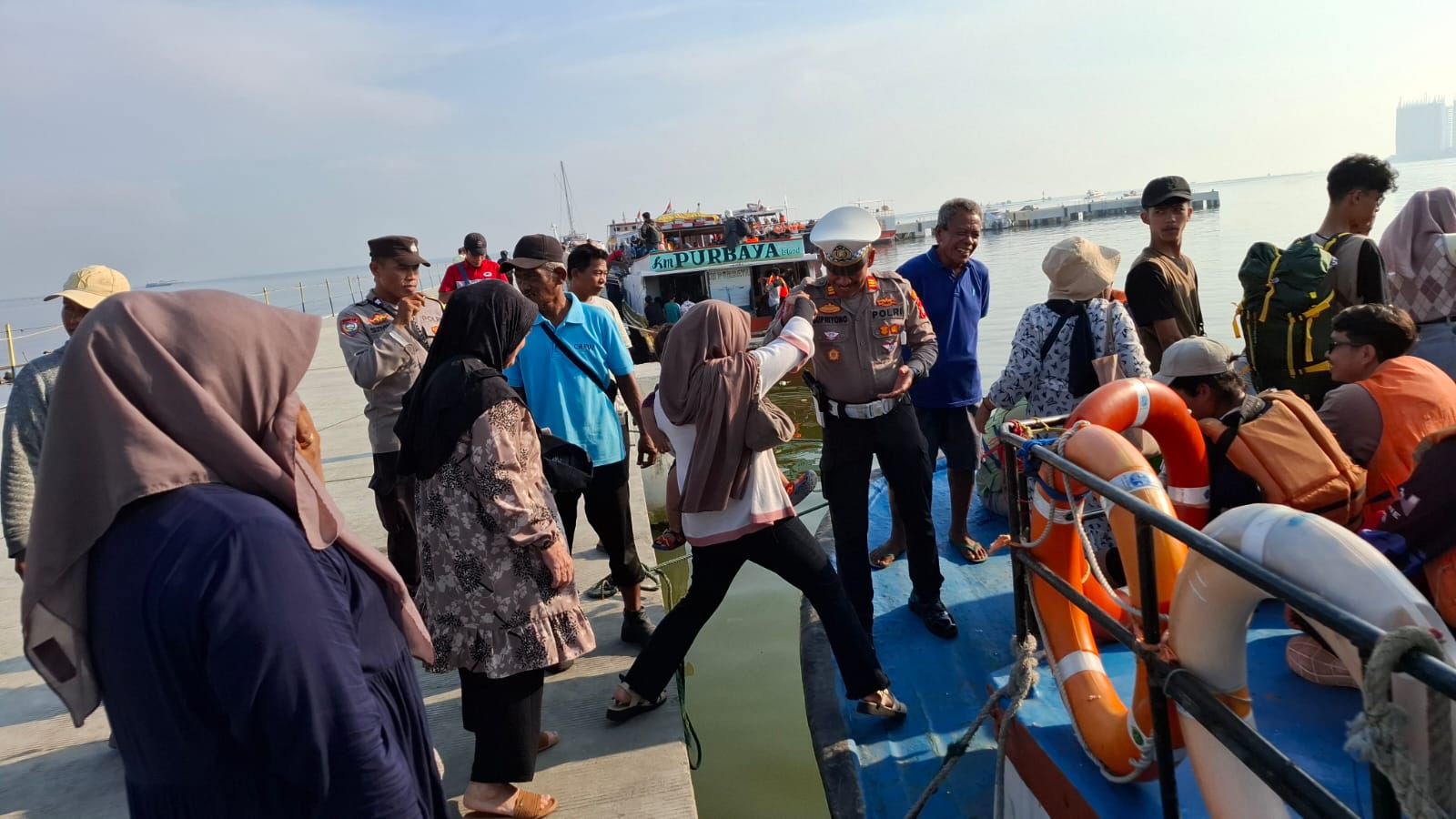 Para petugas Polsek Kawasan Sunda Kelapa, dengan ramah memberikan saran kepada para wisatawan tentang tindakan yang harus diambil dalam situasi darurat atau ketika mengalami kendala selama melakukan perjalanan dengan menggunakan kapal ke Kepulauan Seribu dan selama liburan.