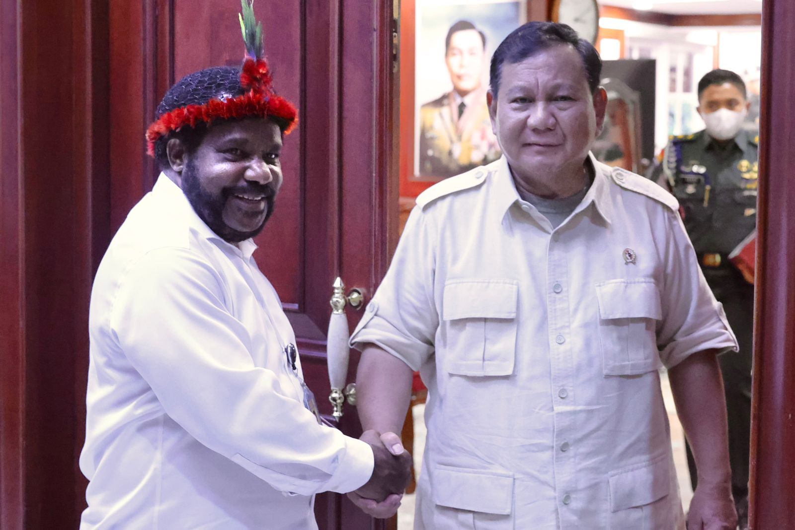 Lenis yang mengenakan topi khas Papua dan berkemeja putih, memberikan salam hormat di depan pintu sebelum memasuki ruangan kantor Prabowo.