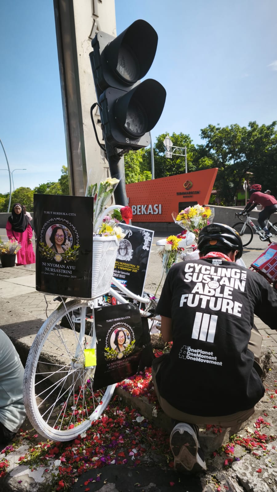 KS, BEKASI – Bike to Work Indonesia (B2W ID) mendesak penegakan hukumterhadap peristiwa hilangnya nyawa pesepeda di jalan raya yang melibatkan kendaraan bermotor. Fatalitas di Jalan Ahmad Yani Kota Bekasi, Selasa (4/11/2025) menewaskan pesepeda Ni Nyoman Ayu Nursastrini akibat tabrakan dengan sepeda motor, mengingatkan kembali pentingnya infrastruktur yang berpihak pada pesepeda, etika berlalu lintas yang manusiawi dan edukasi berkelanjutan. Hal kunci dari tiga perhatian tersebut adalah penegakan hukum. Amplifikasi perlindungan bagi pesepeda di jalan raya dengan urgensi penegakan hukum disuarakan pesepeda Jabodetabek yang berkumpul hari ini, Minggu (9/11/2025) di CFD Kota Bekasi. Aksi spontan ini juga menandai Ghost Bike di Jl. Ahmad Yani, tepat di titik berakhirnya hidup seorang pesepeda.Ghost Bike adalah tugu sunyi bagi pesepeda yang kehilangan nyawa di jalan. Sepeda berwarna putih ditempatkan di lokasi fatalitas sebagai pengingat pentingnya jalan yang aman bagi semua.