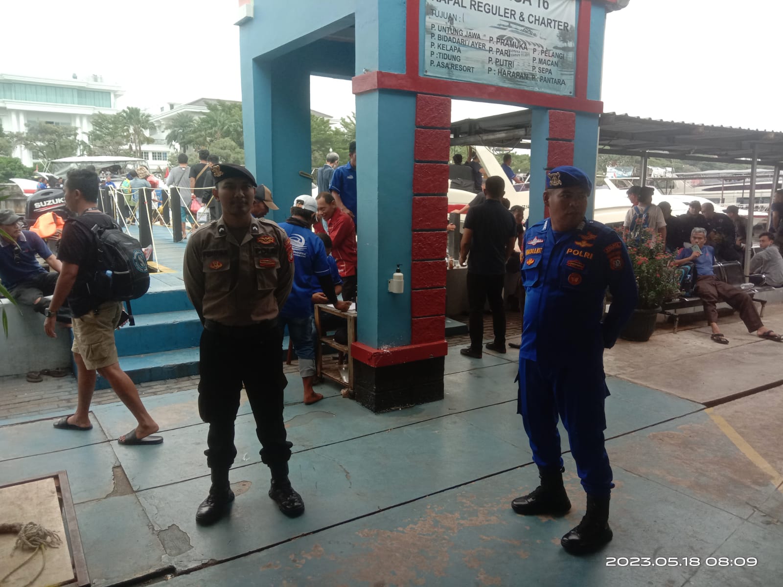 KS, JAKARTA – Dalam pengamanan dermaga 16 dan 17 Marina Ancol, Kanit Binmas Polres Kepulauan Seribu, AKP Abdul Kadir, turun langsung untuk mengamankan keberangkatan wisatawan dan penduduk menuju wilayah Kepulauan Seribu, Kamis (18/05/2023).