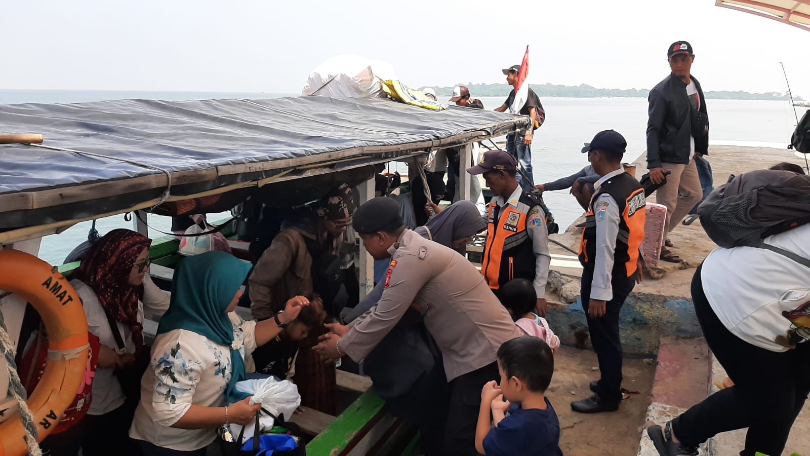 KS, JAKARTA – Anggota Polsek Kepulauan Seribu Selatan dari Polres Kepulauan Seribu melakukan pengamanan di dermaga Pulau Untung Jawa dengan pendekatan yang humanis pada Senin (24/06/2024). Dalam kegiatan tersebut, para penumpang yang turun dari kapal disambut dengan sikap ramah oleh petugas kepolisian, yang memastikan keamanan dan kenyamanan mereka selama proses debarkasi.