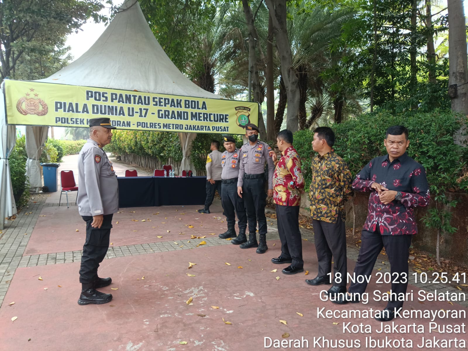 KS, JAKARTA – Subsatgas Gabungan Polsek Kemayoran, Ditpamobvit, dan Ditsamapta Subdit Gasum Polda Metro Jaya melaksanakan pengamanan di Posko Grand Mercure, Kemayoran, Jakarta Pusat, Sabtu (18/11/2023).