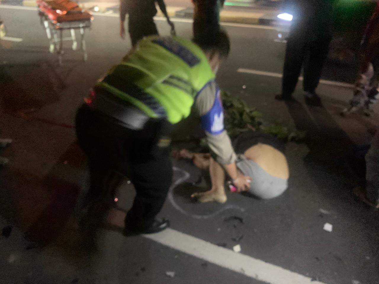 Korban mengalami kecelakaan lalu lintas diturunan Layang Jati Pulo Menabrak diduga Dump Truk.