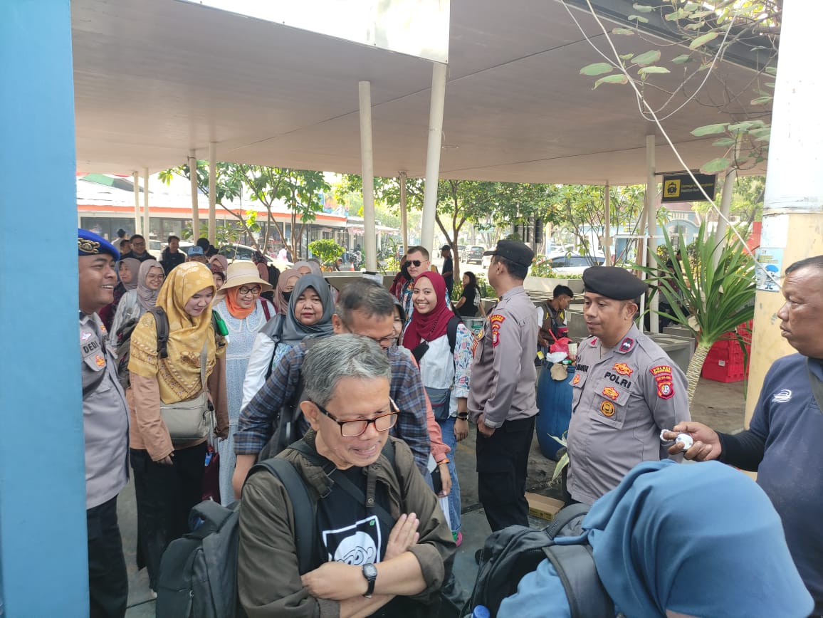 Personel polisi tampak berjaga-jaga dengan sigap, memastikan bahwa setiap proses pemeriksaan dan keberangkatan berjalan tanpa hambatan.
