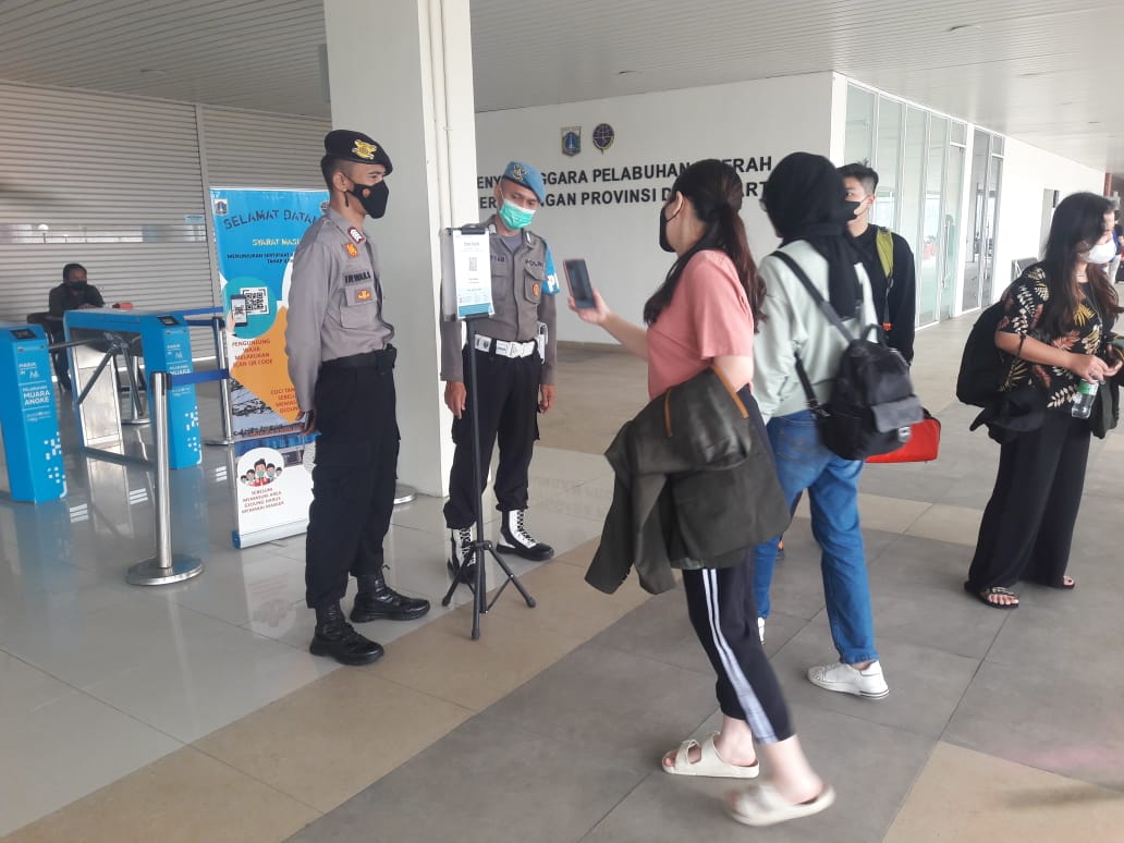 Anggota Polres Kepulauan Seribu yang berjaga di dermaga Kaliadem meminta setiap penumpang yang masuk ke dermaga untuk menscan barcode peduli lindungi yang ada di depan pintu masuk dermaga.