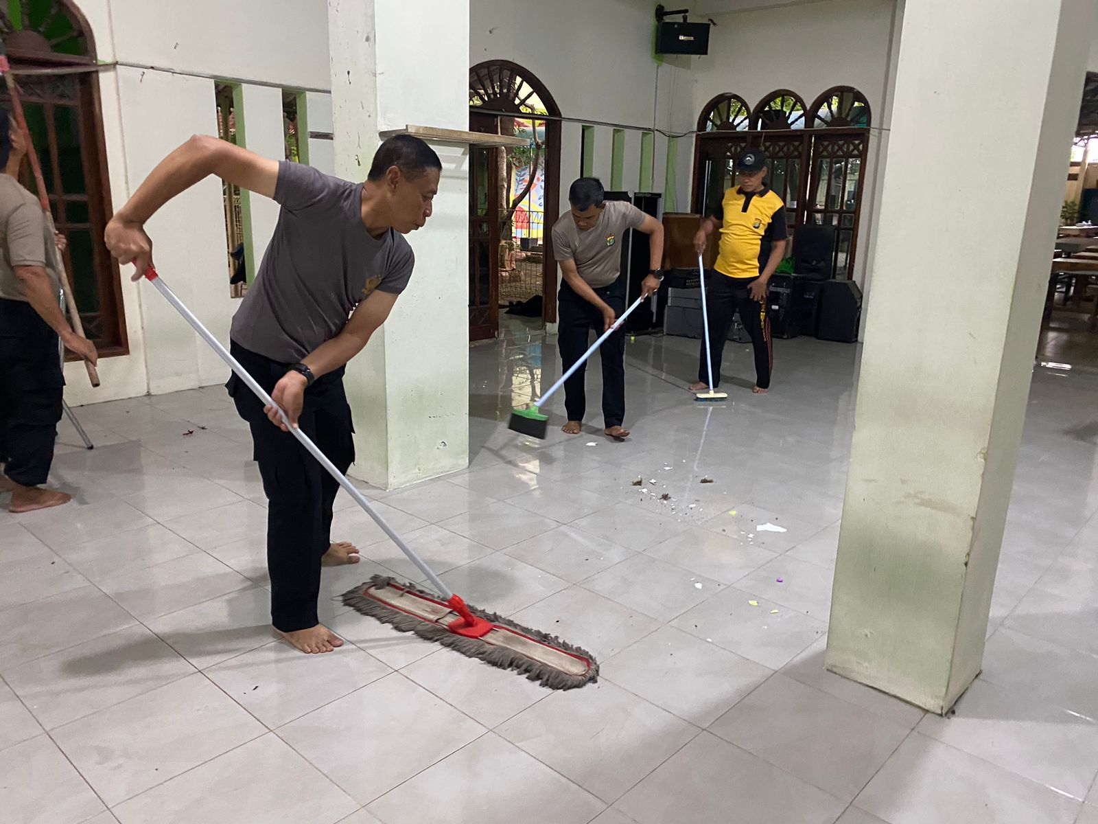 Para personel bersama-sama melakukan pembersihan di area dalam masjid dan lingkungan sekitarnya. Kegiatan berjalan lancar dengan suasana kebersamaan dan kepedulian yang tinggi.