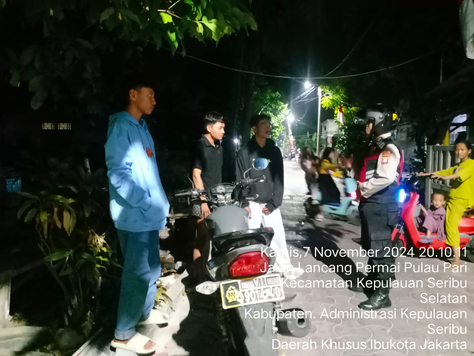 KS, JAKARTA- Polsek Kepulauan Seribu Selatan, Polres Kepulauan Seribu, melaksanakan Kegiatan Patroli Malam Perintis Presisi pada Jumat (08/11/2024) untuk menjaga keamanan dan ketertiban masyarakat (kamtibmas) sekaligus mengantisipasi gangguan kamtibmas di wilayah tersebut. Patroli yang dipimpin oleh Kapolsek Kepulauan Seribu Selatan, AKP Sanyata Harsono, menyasar beberapa titik yang sering menjadi tempat berkumpulnya remaja pada malam hari, dengan tujuan mencegah potensi tawuran dan pelanggaran hukum lainnya.