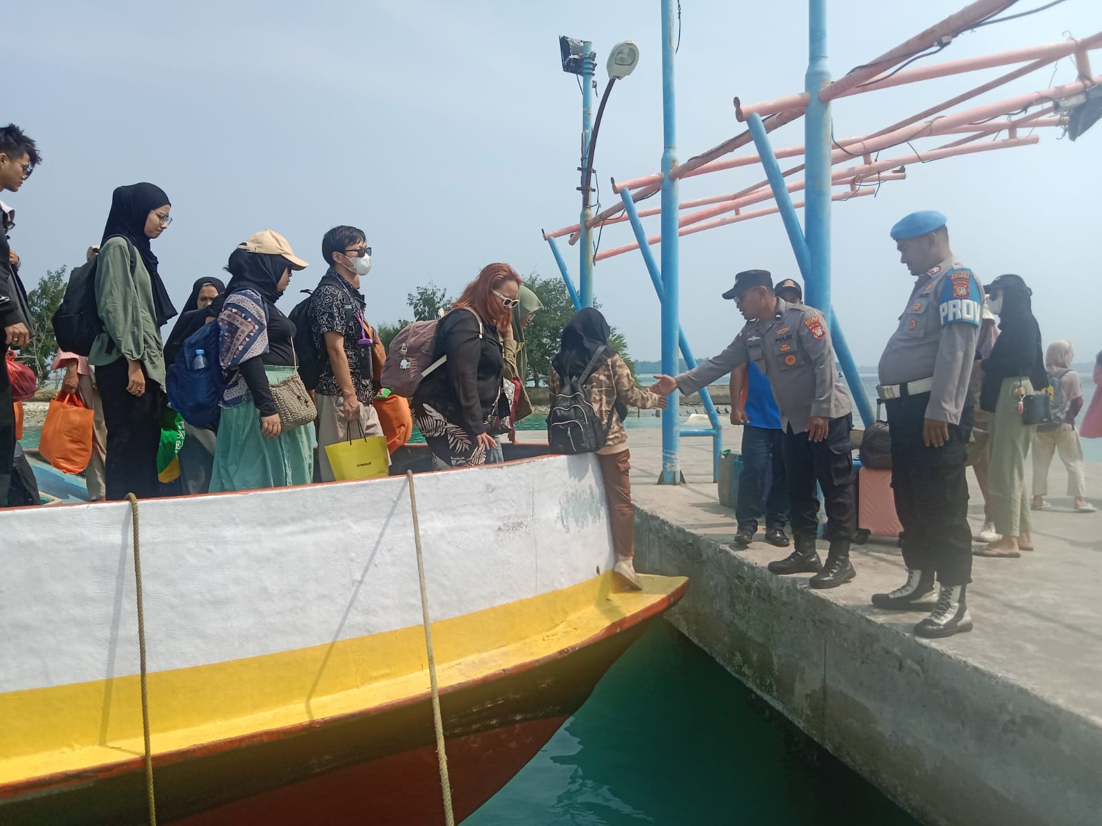 Selain menjaga keamanan, petugas Polsek Kepulauan Seribu Utara juga menunjukkan sisi humanis dengan membantu penumpang turun dari kapal. Kehadiran petugas yang ramah dan membantu ini diharapkan dapat memberikan kenyamanan dan rasa aman bagi para penumpang dan wisatawan yang datang ke Pulau Pramuka.