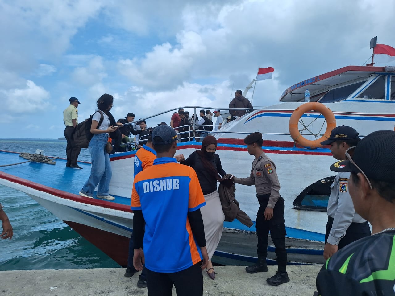 KS, JAKARTA – Anggota Polsek Kepulauan Seribu Utara menunjukkan sikap humanis dengan membantu penumpang turun dari kapal dalam kegiatan pengamanan di Dermaga Pulau Harapan, Kepulauan Seribu Utara, Minggu (09/02/2025). Kegiatan ini bertujuan untuk memastikan keselamatan dan kenyamanan penumpang serta menciptakan situasi yang aman dan kondusif di wilayah perairan.