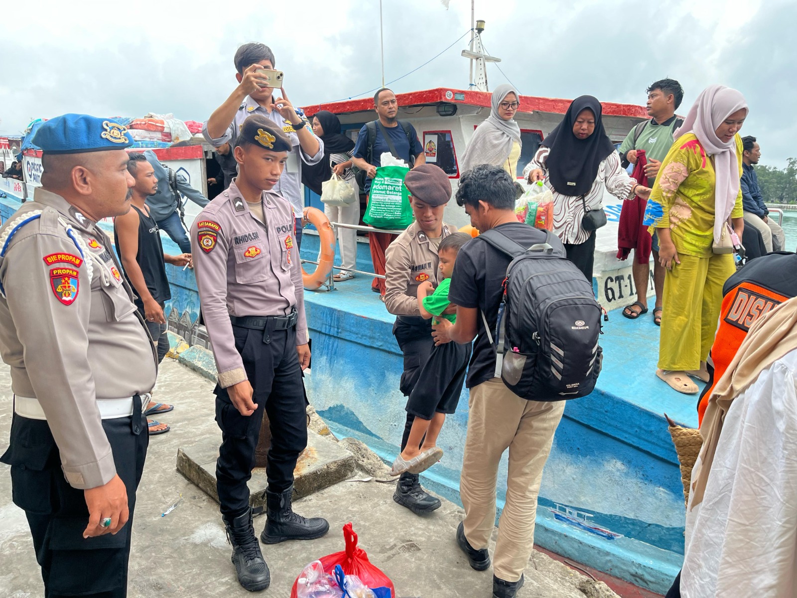 Dalam kegiatan tersebut, tampak sikap humanis anggota kepolisian saat membantu para penumpang kapal yang baru tiba di dermaga.